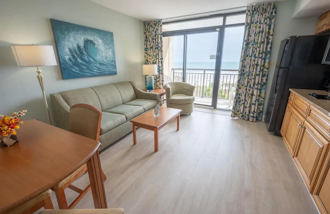 No Steps, Low Floor, Oceanfront Balcony, Pools! apartment offers a patio, a balcony, and a living room, as well as comforts like climate control. For added convenience, a separate toilet, a hot tub, and a shower are available at the property. A hairdryer and bath sheets can also be found.